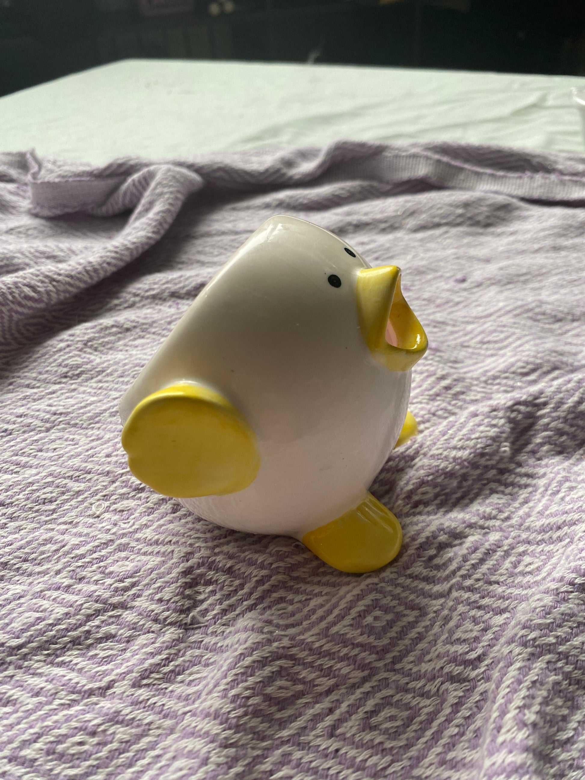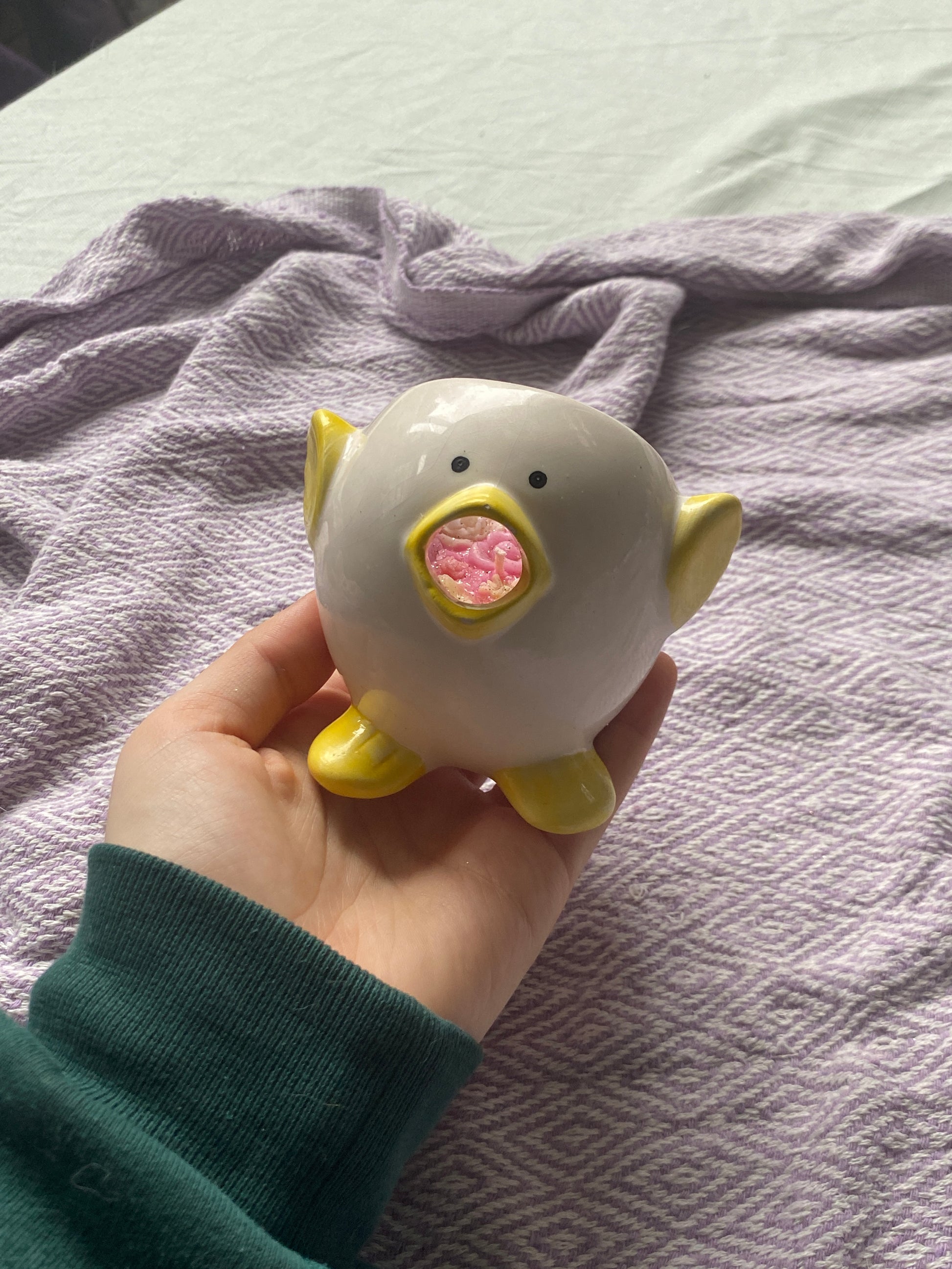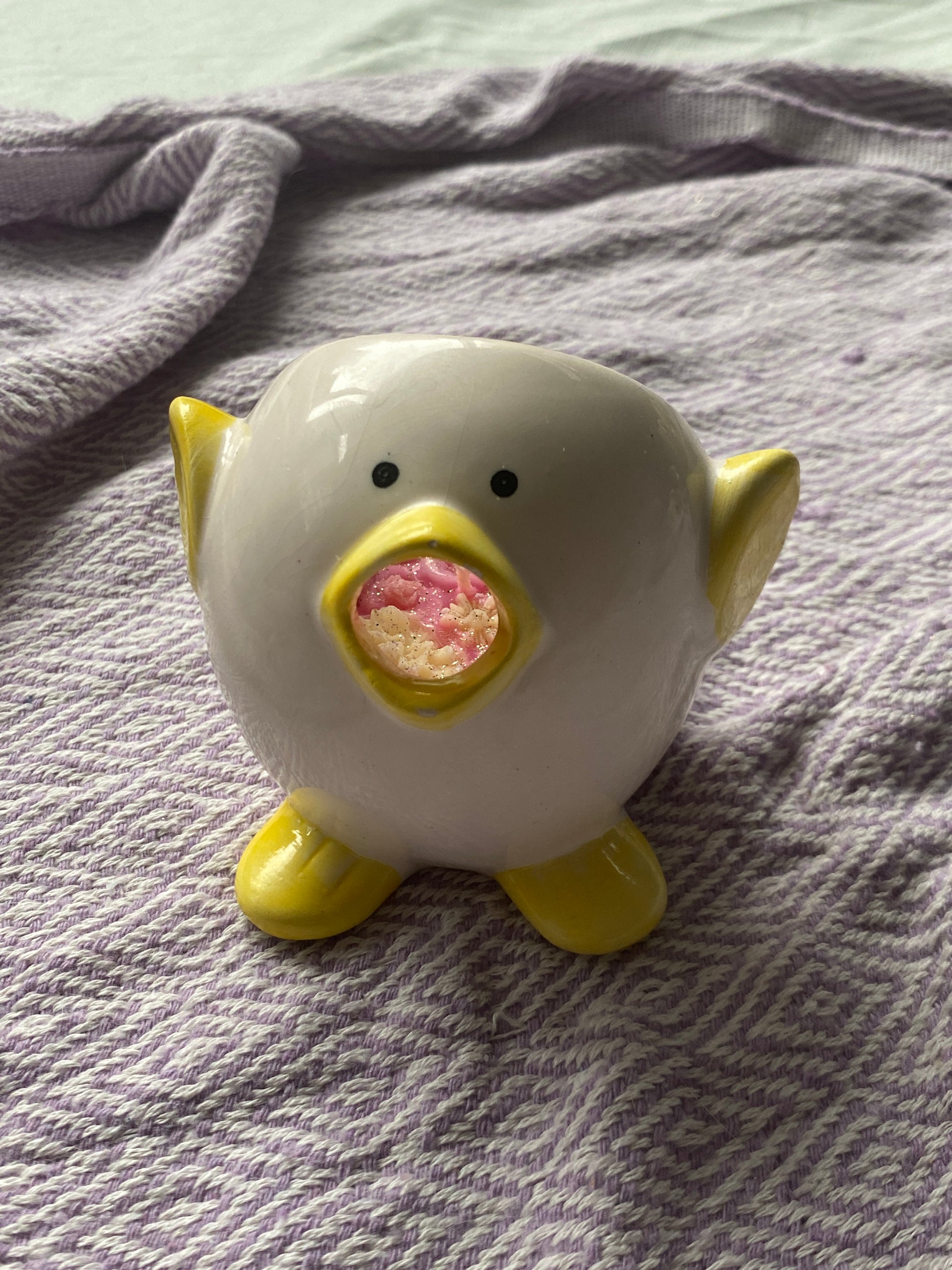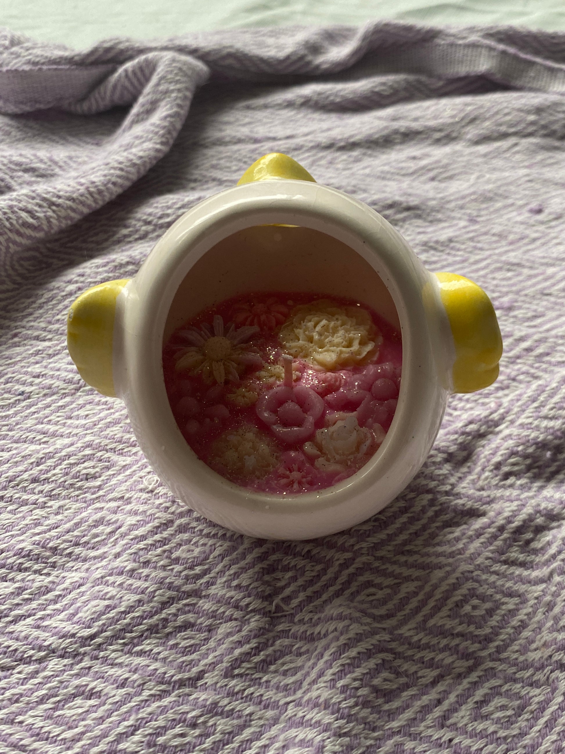 A handmade candle crafted using a chicken-shaped ceramic vessel. Featuring a pink base, and delicate wax flowers on top. This candle is cookie dough scented.