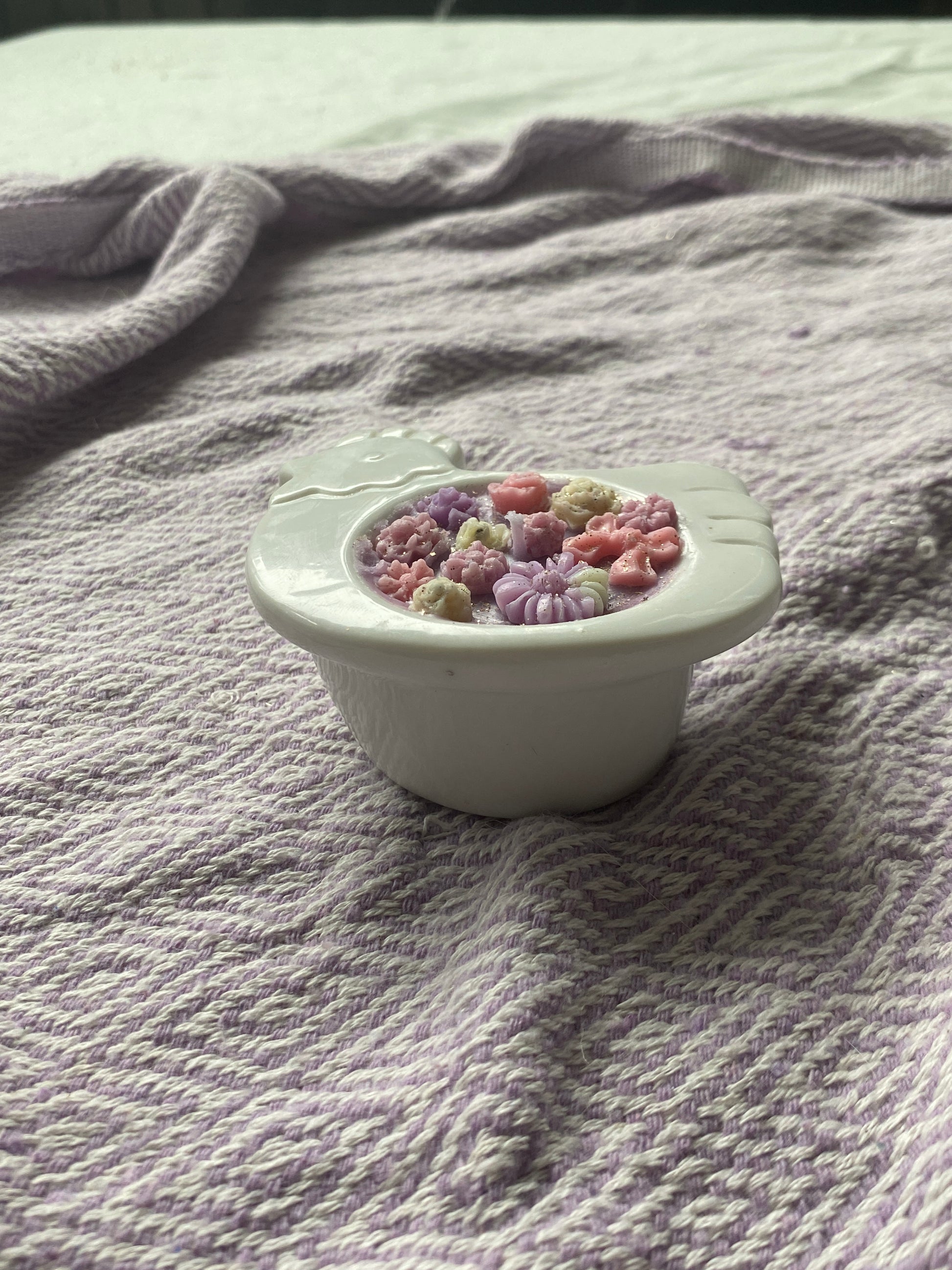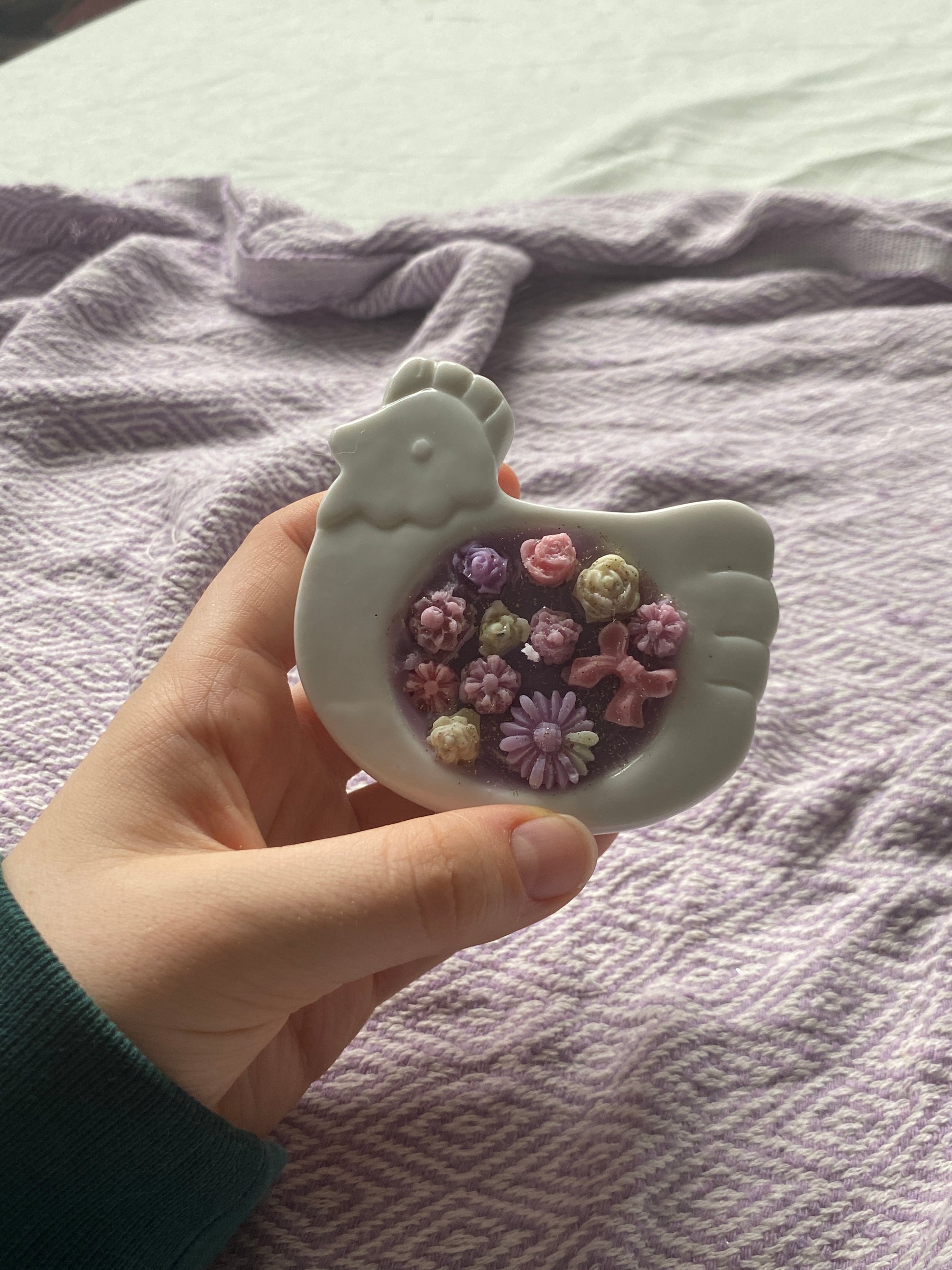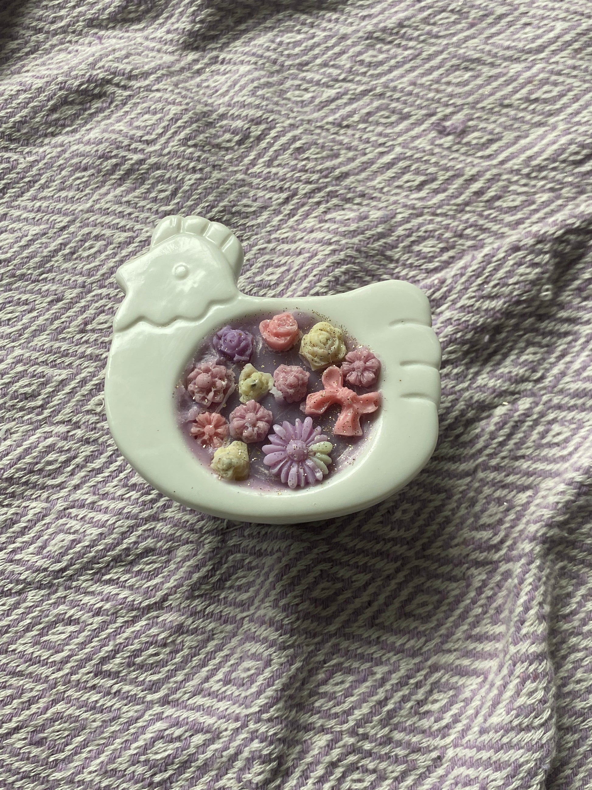 A handmade candle crafted using a chicken-shaped egg cup. Featuring a purple base, and delicate wax flowers on top. This candle is fruity scented.