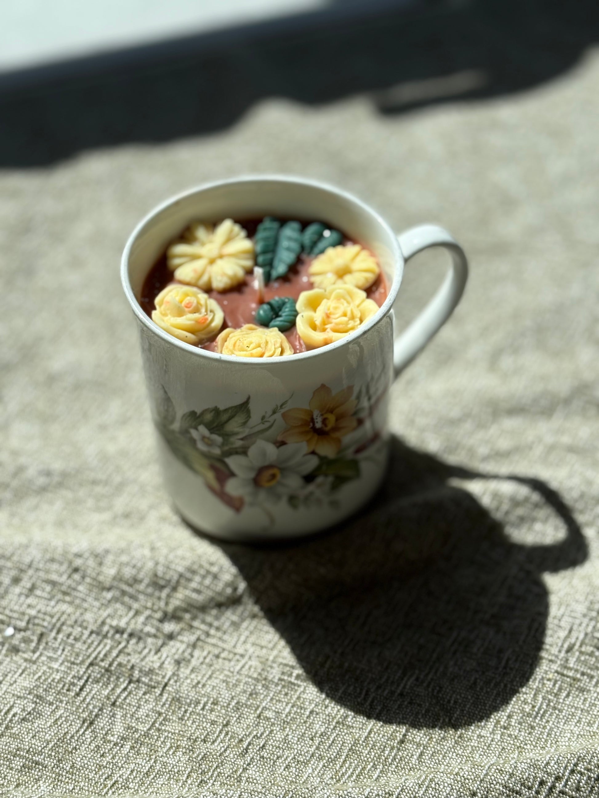 A handmade candle, upcycled from a pre-loved vessel. Instead of letting used-up candle holders, beautiful teacups, or gorgeous ceramic pots and more stay forgotten in an op shop or a landfill, REBLOOM gives past treasures a chance at new life.