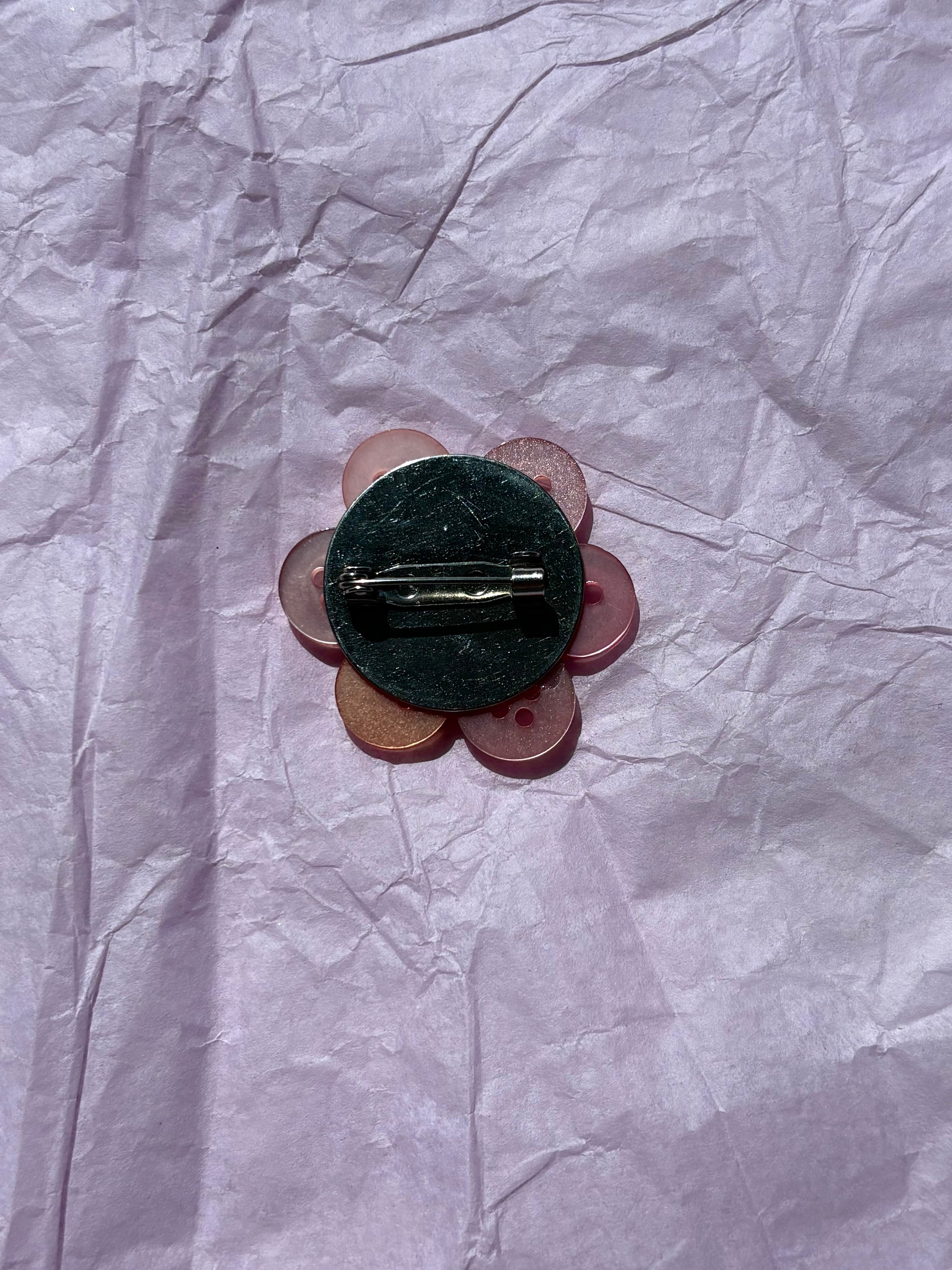 An adorable pin badge for your shirt, jacket, backpack, handbag, tote, lanyard, or jeans - made with cute, repurposed buttons collected from recycling centres and op shops around Aotearoa. Made with a tarnish-resistant stainless steel base, these flower-themed button pin badges will add an extra bit of whimsy to any of your outfits or accessories.