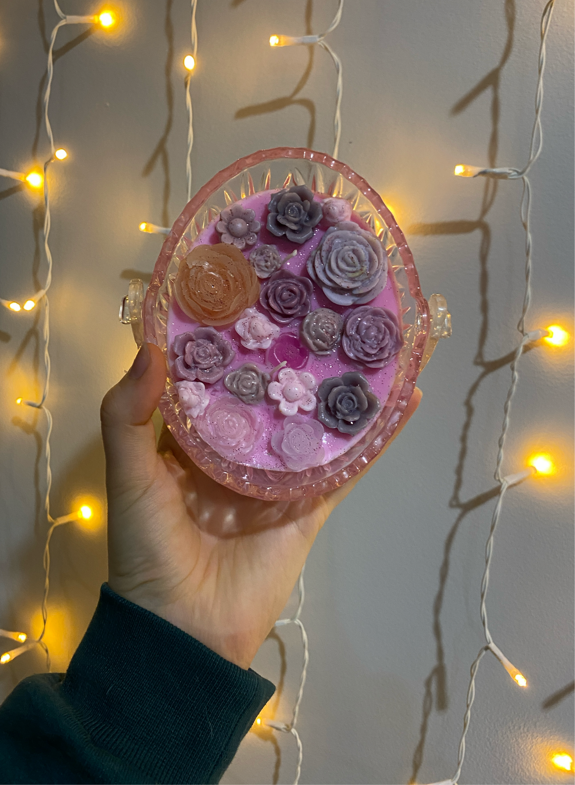 A glass basket candle, complete with functioning handle. Pink wax candle with flower details. One of a kind.