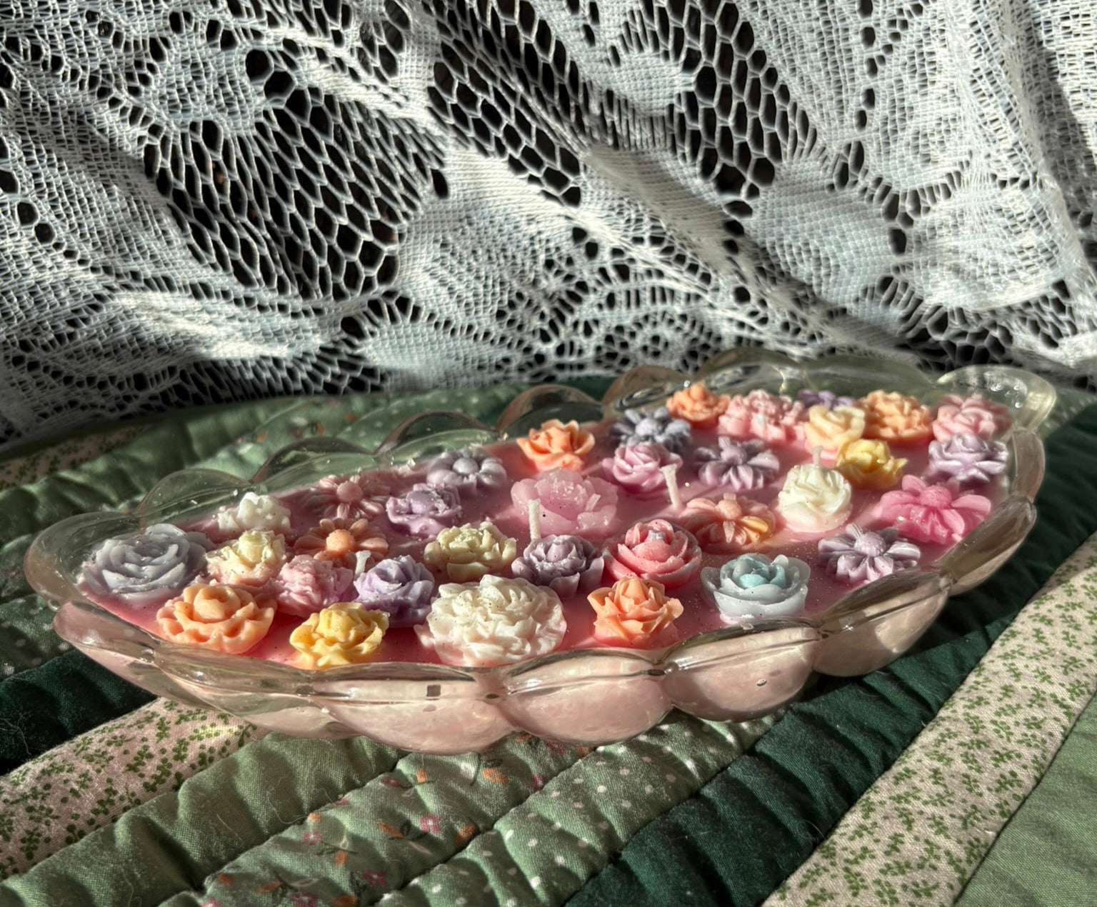 All candles are made using soy wax, and scented with fragrance oils. Each candle is decorated with small flowers on top, also handmade from soy wax.