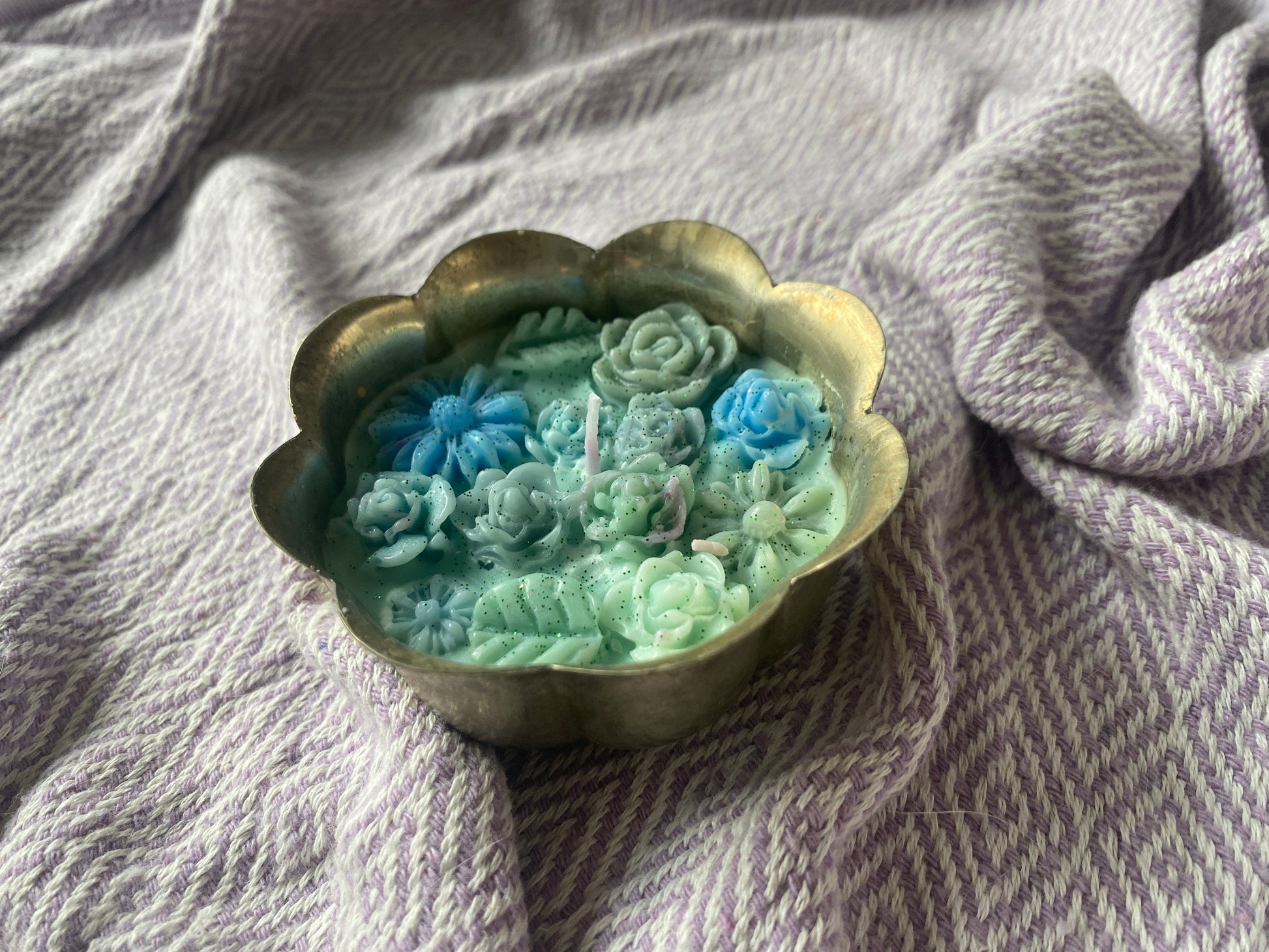 A one of a kind candle. Made from a unique, gold, flower-shaped vessel. Sweet fragrance.