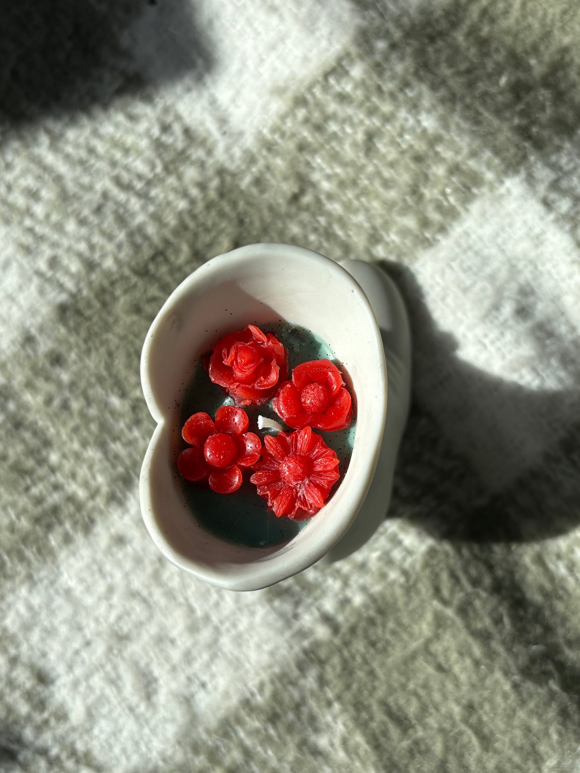All candles are made using soy wax, and scented with fragrance oils. Each candle is decorated with small flowers on top, also handmade from soy wax.