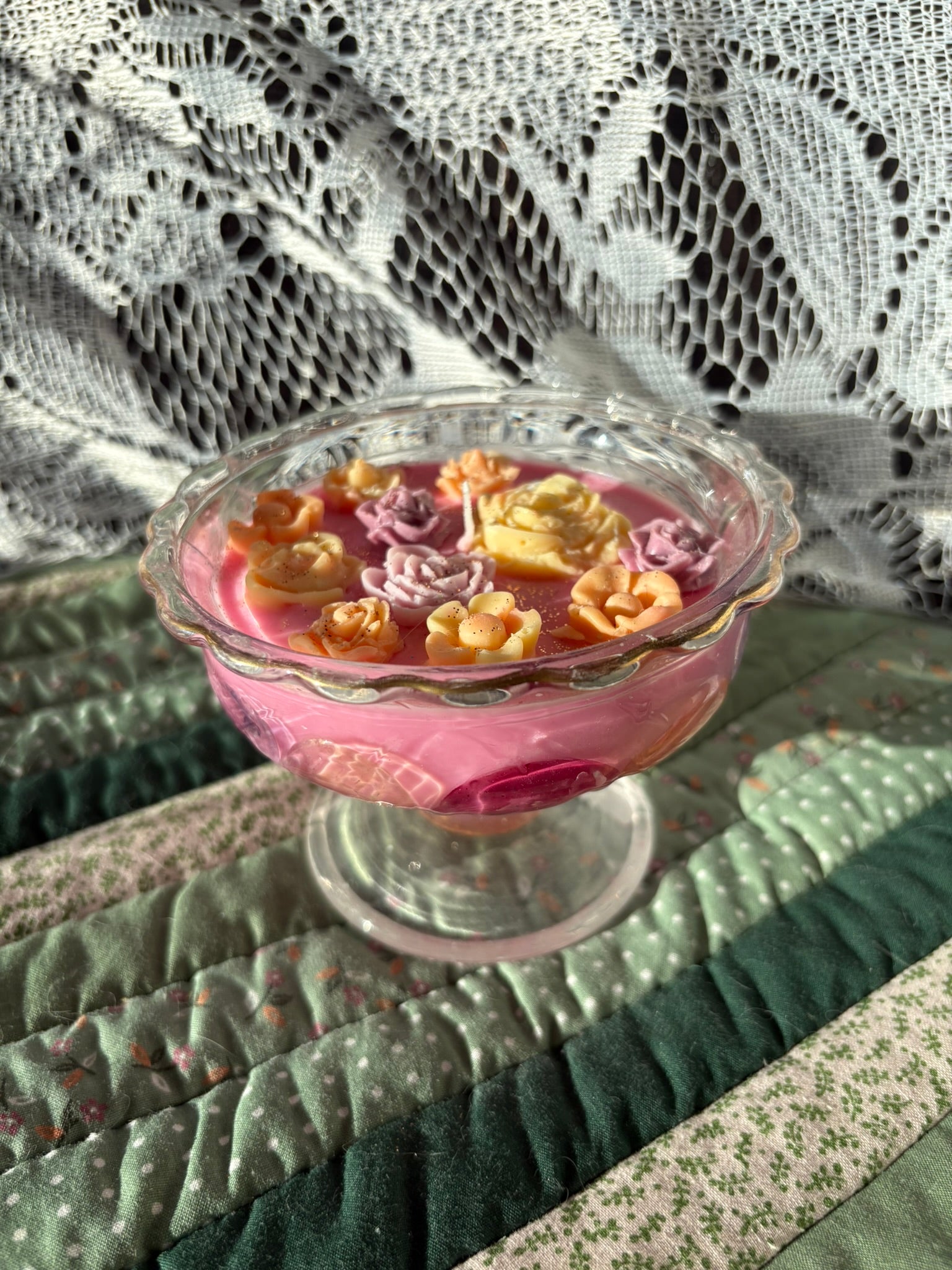 All candles are made using soy wax, and scented with fragrance oils. Each candle is decorated with small flowers on top, also handmade from soy wax.