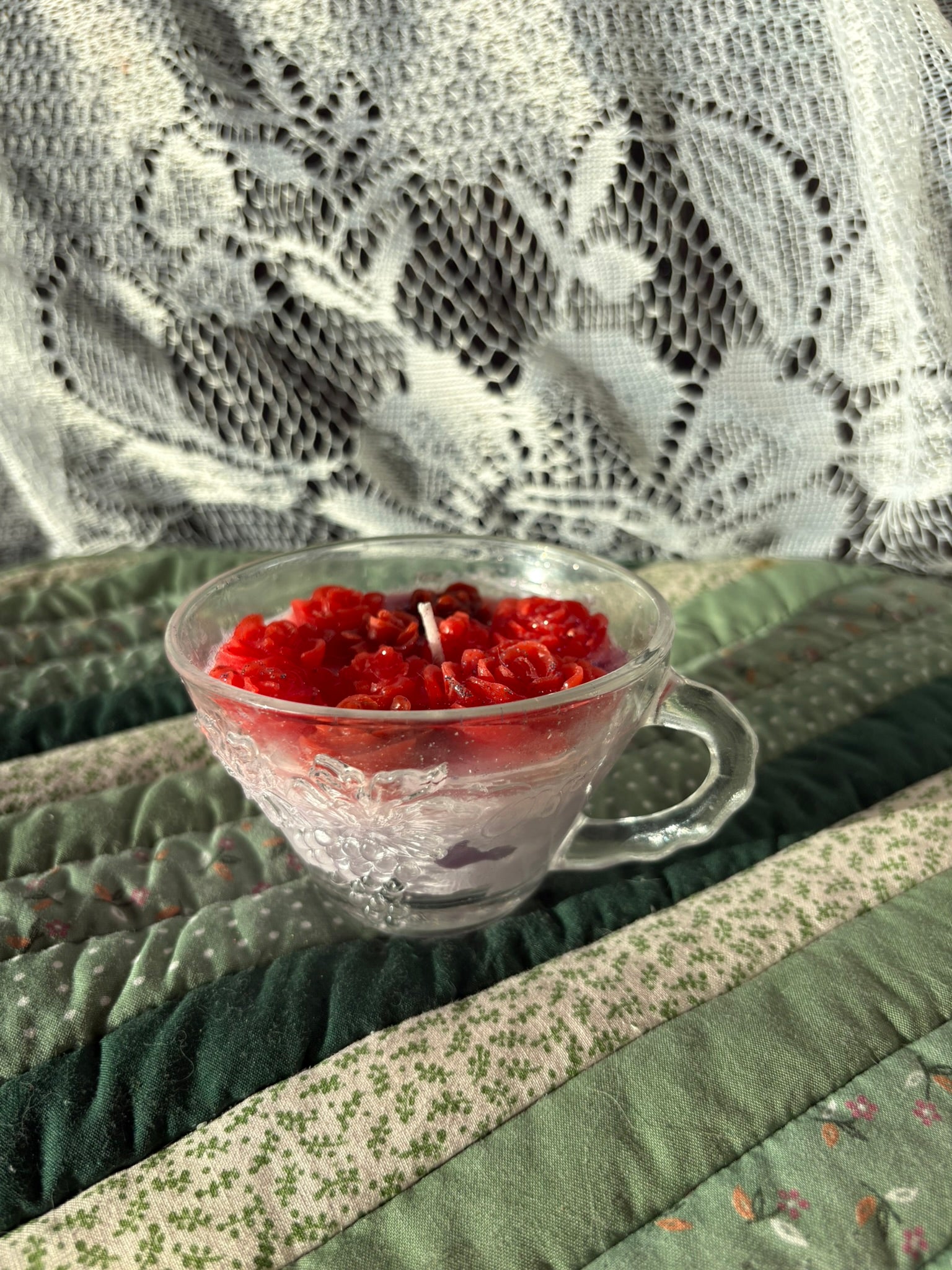 All candles are made using soy wax, and scented with fragrance oils. Each candle is decorated with small flowers on top, also handmade from soy wax.
