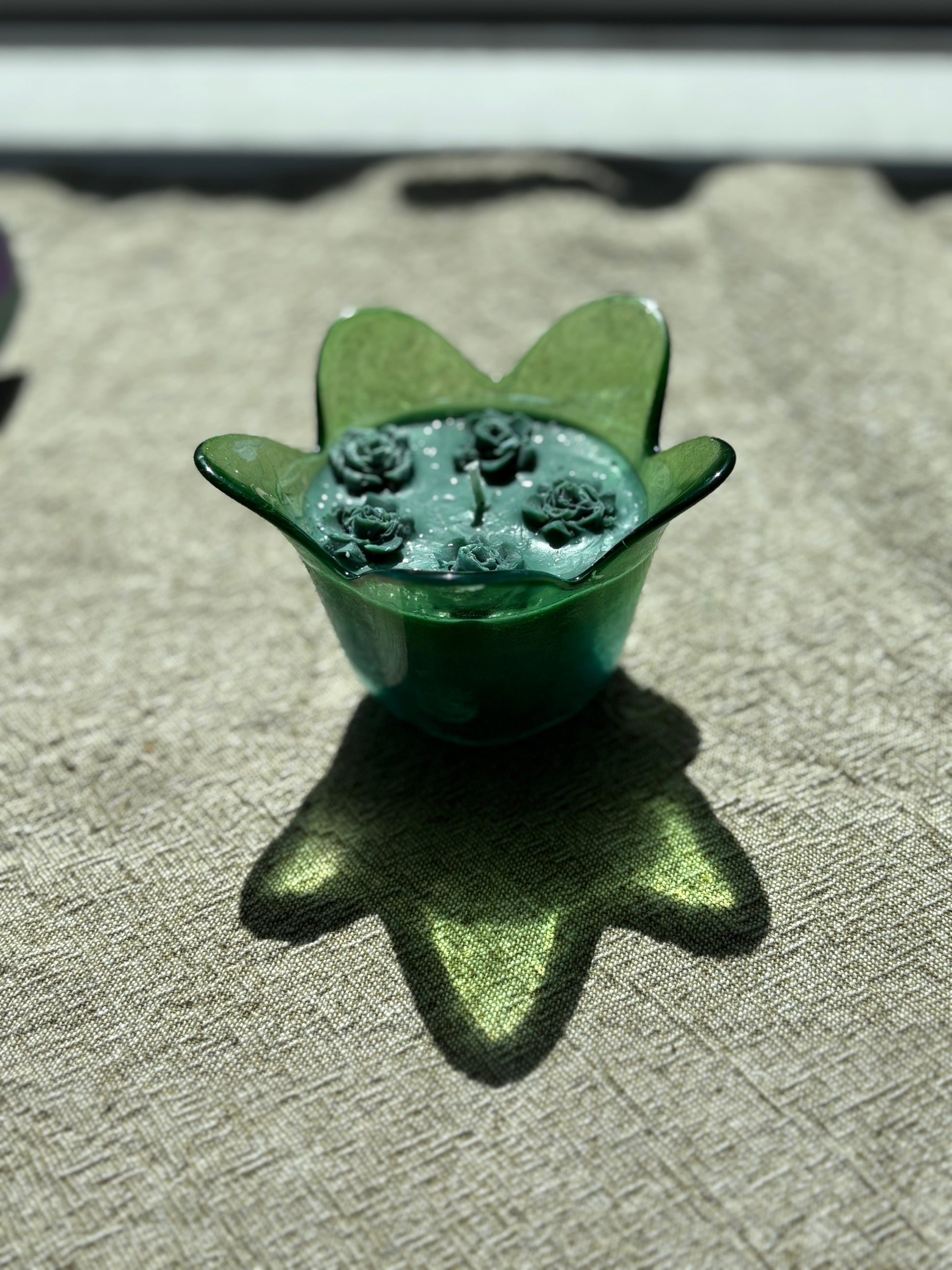 All candles are made using soy wax, and scented with fragrance oils. Each candle is decorated with small flowers on top, also handmade from soy wax.