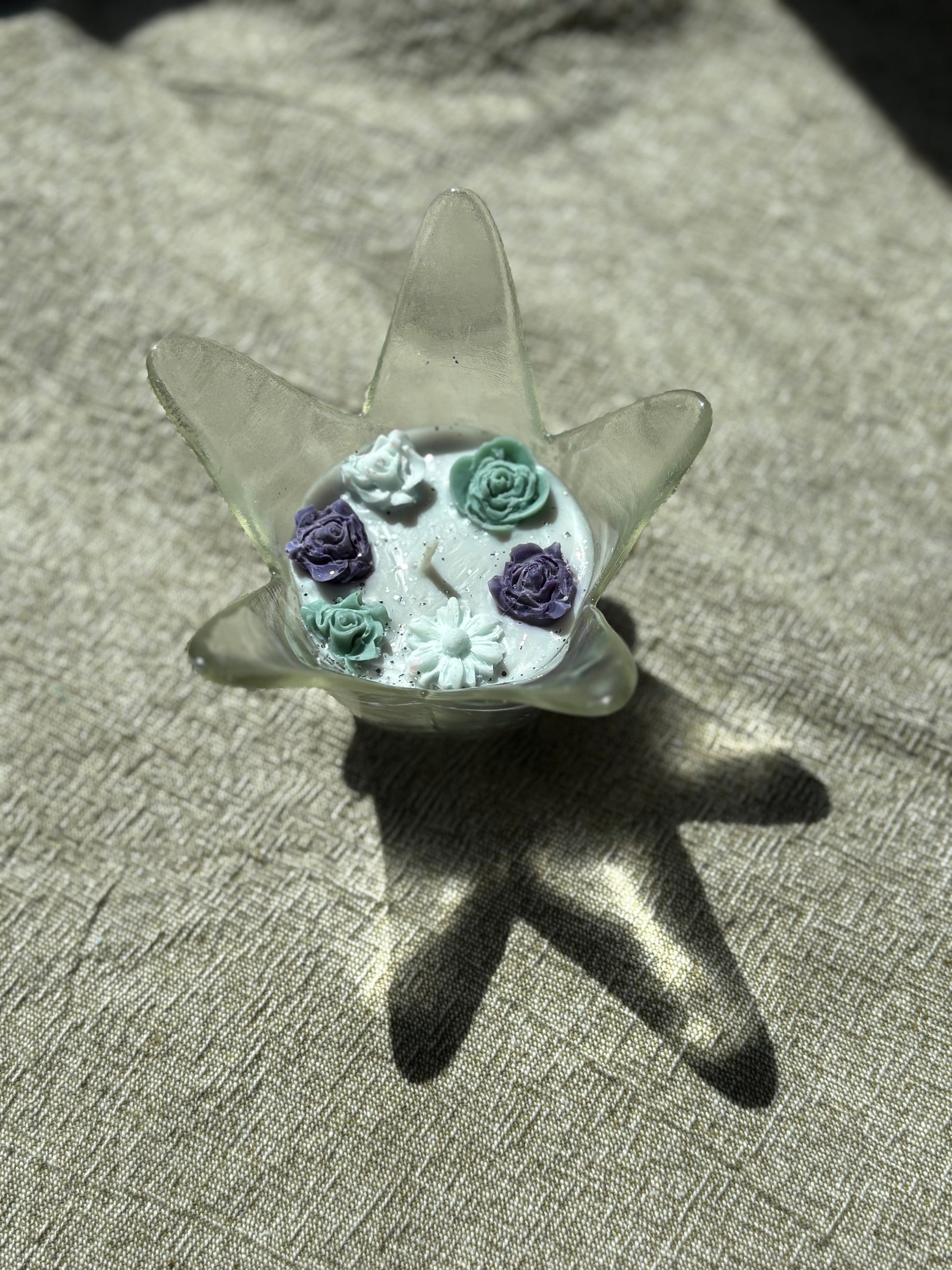 All candles are made using soy wax, and scented with fragrance oils. Each candle is decorated with small flowers on top, also handmade from soy wax.